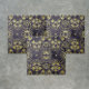 Elegantes dekoratives Fliesendesign mit goldgeprägten Imitaten auf dunklem, lila Marmorboden.