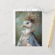A regal peacock, positioned centrally within a vertical frame, is the main subject. The peacock has a pale blue and white feathered head and neck. It wears a gold crown adorned with a jewel, and has a ring of peacock feathers around its head. The peacock is dressed in an ornate, ruffled, lacy collar and a feathered, cape-like garment in shades of blue. The bird is accessorized with a delicate necklace. It is surrounded by large pale pink and white roses. The peacock’s head is in a slight three-quarter profile facing to the left, with a gentle expression and large blue eyes. The background is a soft, muted teal with stylized, leafy embellishments. The lighting is soft and diffused, creating a serene, almost painterly atmosphere. The composition is reminiscent of a portrait, emphasizing the elegance and majesty of the bird.