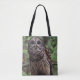 Tasche mit Barriereauge. Eine schöne, erwachsene Eule, die auf einem Baumstamm steht. Foto von Brian Kraus.