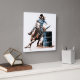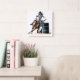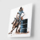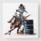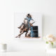 Pop Art Grafikbild in Braun, Blau und Schwarz eines Mädchens, das mit ihrem Pferd um ein Fass fliegt. Personalisierbar.
