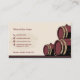 Eine Visitenkarte mit einer Darstellung der Fässer und eines Weinglases in beige und bordeauxfarben. Es kann für einen Weinkeller, einen Weinkeller, einen Sommelier usw. verwendet werden. Es beinhaltet Öffnungszeiten auf der Rückseite.
