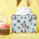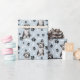 Ein Bild eines schwarz-weißen bärtigen Collie Dogs ist das Muster auf diesem jeden Anlaß Geschenkpapier. Der Hund sitzt inmitten eines Musters aus schwarzen Pfoten und weißen Knochen und wird auf einem silbergrauen Hintergrund wiederholt.
