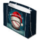 Baseball Ball Rote Weihnachtsmannmütze Name Weihnachten Große Geschenktasche. Das Design hat einen Baseballball mit einer roten Weihnachtsmannmütze auf einem Winterhintergrund mit weißen Schneeflocken. Personalisieren Sie mit Ihrem Namen. Du kannst den Text Frohe Weihnachten ändern. Ideal für einen Sportler, der Lieben hat.