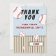 Baseball Geburtstag Dankeschön Karte mit Dankeschön Nachricht, Name und Baseball Bälle. Die Karte ist in Weiß, Rot, Blau und Schwarz gehalten. Auf der Rückseite der Karte befinden sich Baseballbälle auf blauem Hintergrund. Personalisieren Sie die Karte mit dem Namen der Kinder. Sie können den Text ändern oder löschen. Ideal für Kinder, die Baseball und Sport Liebe haben.