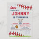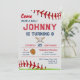 Front and center is a dynamic illustration of a baseball in mid-air, surrounded by vibrant red stitching that pops against a classic baseball white background. The design is accented with playful baseball-themed elements, such as bats, gloves, and helmets, creating a visually engaging and energetic invitation.