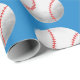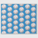 Niedliches Verpackungspapier für Geburtstagsgeschenke mit einer Abbildung eines Baseballs, das zu einem Muster gemacht wurde. Der Hintergrund ist blau.