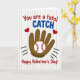 This greeting card centers on a brown baseball glove holding a white baseball with bright red stitching. Two red hearts sit on either side of the glove and ball, adding a clear touch of love to the sporty theme ❤️. The background is white with faint stripes that look like a baseball jersey. At the top, the text reads “You are a total CATCH” in a mix of red and blue letters that stand out easily. Near the bottom, “Happy Valentine’s Day!” appears in red lettering, placed beneath the main image. Small motion marks around the glove make it feel like the ball just landed in place, like a sweet little moment caught in action 💌🍫. It’s a fun, friendly way to say you care
