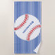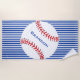 Baseball Design Beach Handtuch mit optionaler Personalisierung. Die Farbe des blauen Streifens und des blauen Namens kann in die Farbe der Auswahl geändert werden.