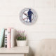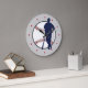 Das ist eine attraktive Wanduhr für den Typ, der ein echter Baseballfan ist. Es verfügt über einen blauen Baseballspieler und eine Fledermaus-Silhouette gegen ein weißes Ballbild mit roter Naht. Das Bild wird auf einem hellgrauen Hintergrund platziert. Anstelle von Zahlen hat diese Uhr rote Diamantmarkierungen...Natürlich!