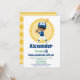 Die Einladung dieses Jungen zum Geburtstag beinhaltet einen niedlichen hispanischen Baseballspieler in marinebasischem Jersey mit Baseballschläger auf gelbem Hintergrund.