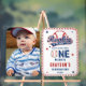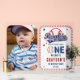 Cute distressed baseball-themed "Rookie of the Year" boy's first birthday party photo design. Features baseball-themed "Rookie of the Year" text with a baseball standing in for the "O" in "One" along with baseball stitching around the rounded rectangular frame. Back features a pattern of stars and baseballs.