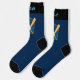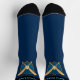 Baseballsymbol mit zwei Fledermäusen und einem Ball über einem blauen Schild. Benutzerdefinierte Hintergrundfarbe. Benutzerdefinierte Farbe des oberen Streifens. Benutzerdefiniertes Monogramm. Benutzerdefinierter Text auf jeder Socke.