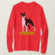 Ein Tri farbiges Basenji auf Alarm, stehendes hohes und bereit zur Aktion in diesem Entwurf mit Zuchtnamen.