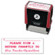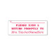 Diese Briefmarke beinhaltet die Nachricht "PLEASE SIGN & RETURN PROMPTLY TO", zusammen mit einer Zeile für eine Signatur oder Initialen, die oben geschrieben werden sollen. Es enthält auch den Namen eines individuellen Erziehers. Es könnte vielleicht von einem Lehrer, Erzieher oder Tutor genutzt werden, um Eltern oder Vormund eines Schülers fragen, die Marke zu überprüfen und anzuerkennen, die ein Schüler bei einem Test, einem Test, einem Test, einem Test, einer Zeitung oder einem anderen Schulauftrag erhalten hat.