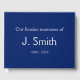 Dieses schlichte Begräbnis- oder Gedenkbuch enthält die Meldung "Unsere liebsten Erinnerungen von", den personalisierten Namen und das Geburtsdatum/das Sterbedatum des verstorbenen Individuums. Es zeigt hellgrauen Text auf einem blauen Hintergrund. Es könnte verwendet werden, um die Erinnerungen von jemandem aufzuzeichnen, der vor kurzem verstorben ist.