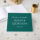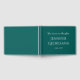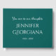 Dieses minimalistische Begräbnis-/Gedenkbuch enthält die Botschaft "Sie sind in unseren Gedanken" und die individuelle Name- und Geburts-/Sterbedaten des weitergegebenen Individuums. Es hat einen weißen Text auf einem dunklen aquamarinen Hintergrund. Es könnte verwendet werden, um die Erinnerungen von jemandem aufzuzeichnen, der vor kurzem verstorben ist.