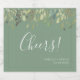 Modernes Hochzeitsflaschenlabel mit Aquarellfarben-Eukalyptus-Blätter, die auf basisgrünem Hintergrund mit weißen Textblöcken in modernen Schriftart liegen