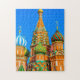 Nahaufnahme der Kuppeln der Basilischen Kathedrale auf dem Roten Platz in Moskau, Russland, gegen den blauen Himmel. Die Kathedrale ist auch als Vasily die gesegnete Kathedrale und als Kathedrale der Fürstenspaltung der Heiligsten Theotokos auf dem Moat bekannt. Sie wurde 1561 geweiht. Die Kathedrale hat keine Analogie in vorausgehender, zeitgenössischer oder späterer Architektur der Muskovy und byzantinischen Kulturtradition.