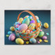 This holiday postcard features a variety of colorful Easter eggs resting in a cute basket.