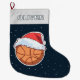 Basketball Ball Red Santa Hat Name Large Christmas Stocking. The design has a basketball ball with a red Santa hat on a dark blue background with white snowflakes. Personalize with your name.