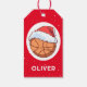 Basketball Ball Rote Weihnachtsmannmütze Weihnachtskid Name Geschenkmarken. Spaß Basketball mit roter Weihnachtsmannmütze auf rotem Hintergrund mit weißen Schneeflocken. Das Tag hat eine Namensvorlage - personalisieren Sie das Tag mit Ihrem Namen.