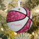 Dieses niedliche Basketballornament zeigt das realistische Bild eines Basketballs, der abwechselnd rosa und weiß aufgefärbte Basketballfelder mit zarten doodle Blume, Federn und Paislien hat, die auf den rosa Basketballplatten gemustert sind - personalisieren Sie den Namen des Athleten auf der Vorderseite, das Gedenken an das Jahr auf der Rückseite - von katz_d_zynes