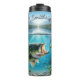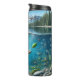 Dies ist eine detaillierte und realistische Abbildung, die in zwei Ansichten aufgeteilt ist: über und unter dem Wasser. Über dem Wasser ist ein ruhiger See umgeben von einem Wald aus Kiefern und Bergen unter einem hellen, sonnigen Himmel. Unter dem Wasser steht ein großer Bassfisch mit einem breiten Mund offen, der einen lebendigen grünen Angellure beißt. Die Unterwasserszene ist mit klarem, kristallklarem Wasser, glatten Steinen, verschiedenen aquatischen Pflanze und kleineren Fischen gefüllt. Das Sonnenlicht dringt ins Wasser ein und erzeugt eine atemberaubende und lebensechte Wirkung.