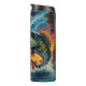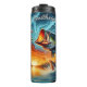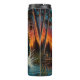 Dies ist eine atemberaubende und detaillierte Abbildung eines großen Bassfisches, der bei Sonnenuntergang aus einem See austretet. Der Fisch, der weit offen im Mund ist, sucht nach einem Angelloten. Die Szene ist Set gegen einen lebhaften, feurigen orangen und blauen Sonnenuntergang, mit dramatischen Wolken und einem Kiefernwald. Das Wasser spritzt dynamisch um den Fisch herum, und im Hintergrund ist ein kleiner Holzsteg sichtbar. Die Ästhetik ist eine von Energie, Abenteuer und natürlicher Schönheit.