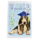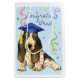 Herzlichen Glückwunsch an Ihren Lieblings-Absolvent mit einem Geschenk in einer Tasche mit einem niedlichen, glücklichen Basset Hound Absolvent mit einem Mörtel inmitten einer Flasche Konfetti.