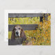 Ein alter Basset Hound hält sich den Kopf durch einen Landzaun mit Wildblumen, um zu sehen, wie es geht und einem freundlichen Hello Hundeliebhaber Postkarte zu geben