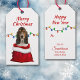 Auf der Vorderseite dieses Holiday Geschenketiketts ist ein Bild eines bezaubernden Basset Hound Welpen in einem rot-weißen Weihnachtsgeschenksack. Hinter dem Hund befindet sich eine Reihe farbenfroher Urlaubslichter. Im Text oben steht "Frohe Weihnachten". Die Rückseite des Tags wiederholt das Bild der Holiday-Lichter, mit Textfeldern in rot, die Sie anpassen können.