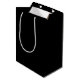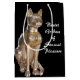 Mittlere schwarze glatte Geschenktasche mit einem Bild, auf der Front, einer Messingstatue der alten ägyptischen Göttin Bastet und der Beschreibung von ihr.