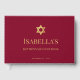 Ein einfaches burgunderrotes und goldenes Bat-Mitzwa-Design, dessen einzige Verzierung der falsche goldene Folien-Davidstern im oberen Teil ist (und auf der Rückseite und auf dem Rücken). Der gesamte Text ist in goldenen Großbuchstaben und kann bearbeitet werden. Der Hintergrund ist burgunderrot.