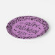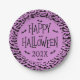 Halloween paper plates featuring a pattern of black bats on a purple or custom color background and the text “Happy Halloween” and customizable year at the center of the plate.