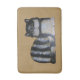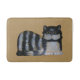 Gestreifte Katze ruht auf Matte. Malerei der schwarz-weiß gestreiften Katze mit langem Fell. Gelbe Augen, Schatten in gelb/braun. Hintergrund hellbraun.