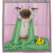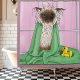 Eine siamesische Katze weicht nass aus einem Bad. Die Katze hat ein grünes Handtuch um sie herum und ihren Gummipuder in einer Kulisse aus rosa Badziegeln. Die Katze ist nicht glücklich über das Bad.