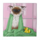 Eine siamesische Katze weicht nass aus einem Bad. Die Katze hat ein grünes Handtuch um sie herum und ihren Gummipuder in einer Kulisse aus rosa Badziegeln. Die Katze ist nicht glücklich über das Bad.