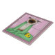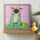 Eine siamesische Katze weicht nass aus einem Bad. Die Katze hat ein grünes Handtuch um sie herum und ihren Gummipuder in einer Kulisse aus rosa Badziegeln. Die Katze ist nicht glücklich über das Bad.
