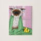 Eine siamesische Katze weicht nass aus einem Bad. Die Katze hat ein grünes Handtuch um sie herum und ihren Gummipuder in einer Kulisse aus rosa Badziegeln. Die Katze ist nicht glücklich über das Bad.