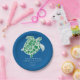 Eine grüne Batik ähnliche Dummkopfseeschildkröte auf einem Hintergrund des königlichen Blaus dient als kundengerechtem Kind- oder Erwachsen-Geburtstags-Party-Papier-Teller. Vervollkommnen Sie für den Marinenaturschützer oder den zukünftigen Marinebiologen.