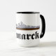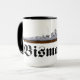 Mug with drawing of the famous German battleship Bismarck of world war II with the name of the ship written with fraktur letters.