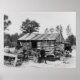 Altes Foto von überholtem Bauer vor der Blockhütte umgeben von antiken Autos, Werkzeugen, Möbeln und Junk. In der Nähe von Black River Falls, Wisconsin. Foto 1937 von Fotograf Russell Lee aufgenommen.