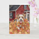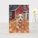Diese Grußkarte enthält ein Aquarellbild eines Welpen, der in einem Haufen Blätter außerhalb eines roten Bauernhauses spielt.