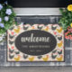 Willkommen Niedliches Hühnermuster Personalisierte Türmatte mit einem farbenfrohen, niedlichen Hühnermuster mit "welcome" in einem weißen Skript-Schriftart. Personalisieren Sie es mit Ihrem Familiennamen und dem festgelegten Datum.