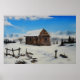 Drucken von Gemälden im Idaho-Haus. Schneeszene, Hütte in ländlicher Landschaft mit blauem Himmel.