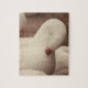 Eine Gans im Portrait auf einem Bauernhof. Die Gans putzt ihr weißes Gefieder.