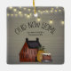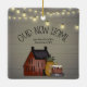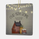 Dieses rustikale, primitive neue Zuhause Weihnachtsschmuck verfügt über eine Saltbox House-Gruppe mit einer grungenhaften Kerze, Salzwasser-Haus und Ananas. Eine Reihe Vintager Lichter hängt über dem Kopf. Personalisieren Sie Ihr Ornament mit Ihrer Adresse, indem Sie das benutzerfreundliche Design-Tool von Zazzle verwenden. Hintergrund ist rustikales Holz.