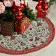 Der elegante personalisierte Weihnachtsbaumrock im Bauernhaus weist ein von Hand gezeichnet Hirschgeflecht auf, das in Rot- und Cremetöcken mit festlichen Poinsettia-Blume, Kakteen, heiligen und roten Winterbeeren verziert ist. Alle Zimmer sind mit einem eleganten, grünen Hintergrund und einer roten Grenze versehen.