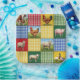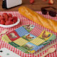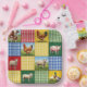 Ein farbenfrohes Patchworkdeckendesign mit Gingham-Stoff und Bauernhoftieren