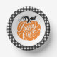 Diese Papierschalen im Bauernstil zeichnen sich durch ein Kürbisdesign mit den Worten "Happy Fall" aus. An der Außenseite ist ein komplett schwarz-weißes Gingham-Muster.